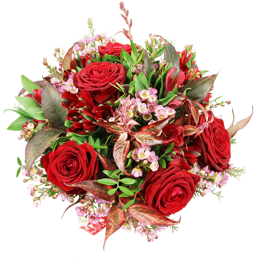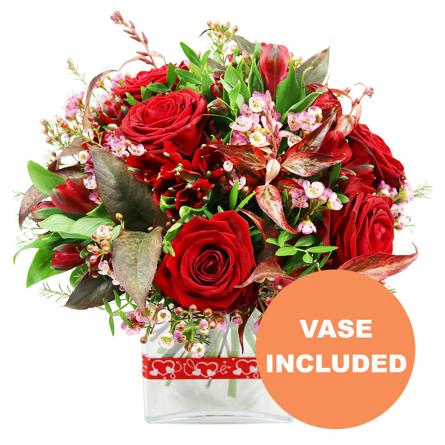 Celebrate beauty with our Splendid Ruby Fusion bouquet, a harmonious blend of vivid red roses, stunning red alstroemeria, charming wax flowers, lush pistacia, and vibrant red greenery. This unique arrangement is crafted to leave a lasting impression.